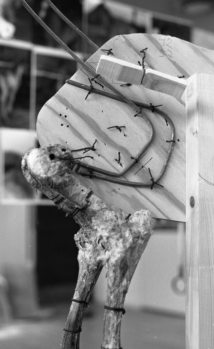 'Montering av föl: :: Detaljbild av grundstommen till fölmontaget. Närbild på del av centralbrädan med extremitetben. :: :: Fölet fött 1982-07-25, död 1982-07-26 i Slottsskogen. Montaget utfört av Jeanette Setterberg finns utställt i däggdjurssalen i monterskåp nr 62 (2007-01-14). :: :: Coll.an. 14334. :: :: Ingår i serie med fotonr. 5814.'