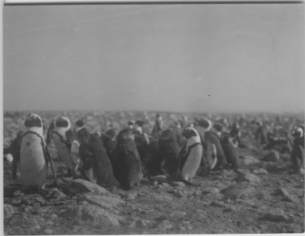 'Afrikansk pingvin på land. Närbild på pingvinflock. :: :: Ingår i serie med fotonr.167-179, 181-184, 186-191, 193-196, 198-203 samt 205-215 med foton från Hilmer Skoogs expedition till Sydafrika år 1912-1913.'