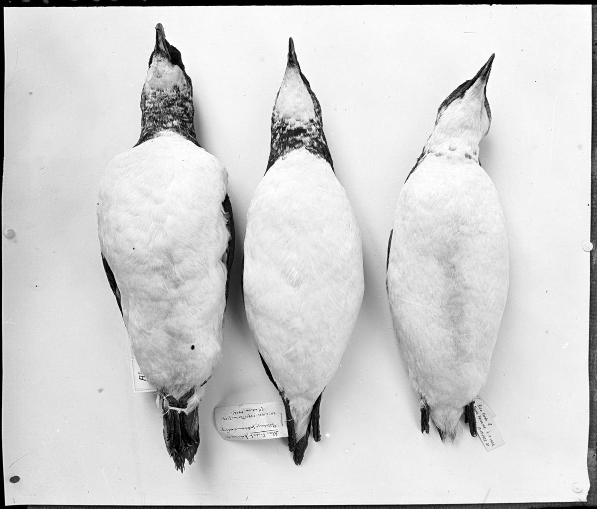 'Skinn av 3 tordmular, liggande bredvid varandra. Ur F.Salomonsen:The Atlantic Alcidae,s.13 :: :: Se fotonr. 4683-4686.'