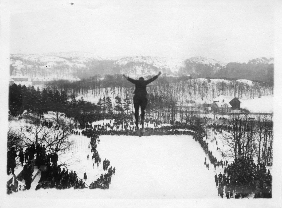 Skidhopptävling i Brage-backen. Bilden tagen uppifrån med en hoppare i luften och stor publik nedanför. Vinterlandskap. På avstånd syns byggnader, hus.