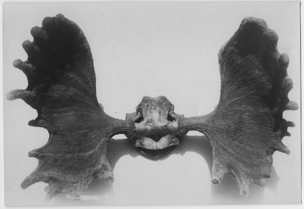 'Älghorn, subfossilt, sett framifrån. Största bredden 108 cm. :: Vikt 13 kg. Fynddatum 1909-08-00. :: :: Bilden med i Göteborgs Naturhistoriska museums Årstryck 1911 s.24'