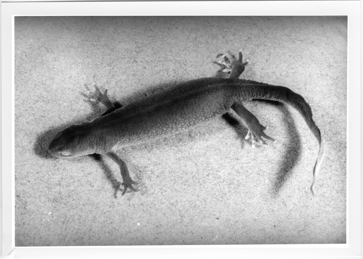 'Närbild på större vattensalamander sedd ovanifrån. :: :: Ingår i serie med fotonr. 6765:1-39.'