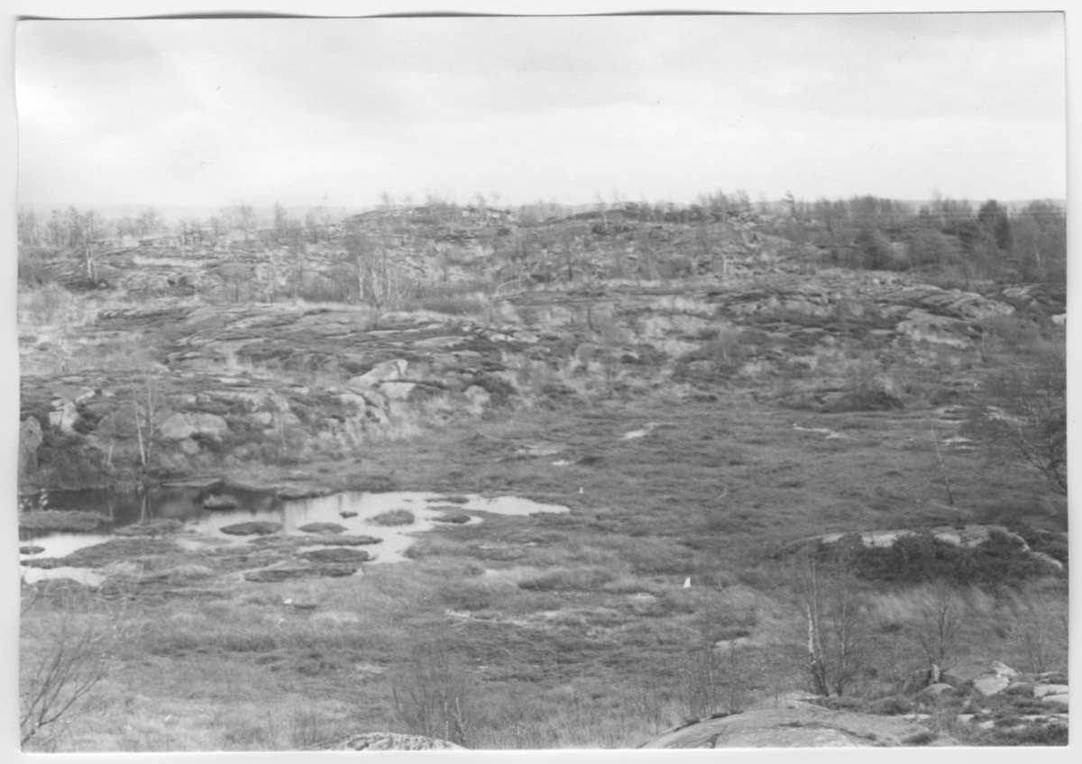 'Bildtext: ''Hällparti. Riktning 133.'' :: Vy med fuktig mark ev. kärr i förgrunden och vy med berghäll. :: :: Ingår i serie med fotonr. 6970:1-1125, dokumentation av Hisingens naturgeografi, visande landskapsformerna i stora drag och gjord inför exploateringen av området. Platserna för fotograferingen finns utsatta på karta i skala 1:4000 som finns på Göteborgs Naturhistoriska musem. Fotoriktningen mättes med kompass i gammalgrader.'