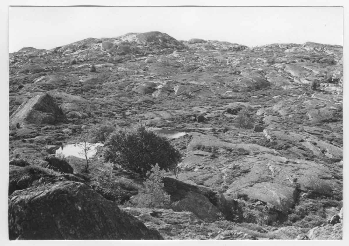 'Bildtext: ''Rundhällandskap med sjö. Riktning 282.'' :: I förgrunden vattensamling, sjö på i stort sett kala berghällar. :: :: Ingår i serie med fotonr. 6970:1-1125, dokumentation av Hisingens naturgeografi, visande landskapsformerna i stora drag och gjord inför exploateringen av området. Platserna för fotograferingen finns utsatta på karta i skala 1:4000 som finns på Göteborgs Naturhistoriska musem. Fotoriktningen mättes med kompass i gammalgrader.'