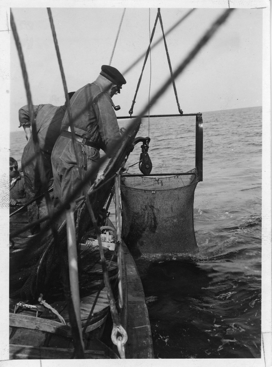'Akka-expeditionen sommaren 1930: :: :: Trålen (agassiztrål) är tömd och går ut för sköljning. 3 st män på däck. Leonard Axel Jägerskiöld främst. :: :: Ingår i serie med fotonr. 2033-2087.'