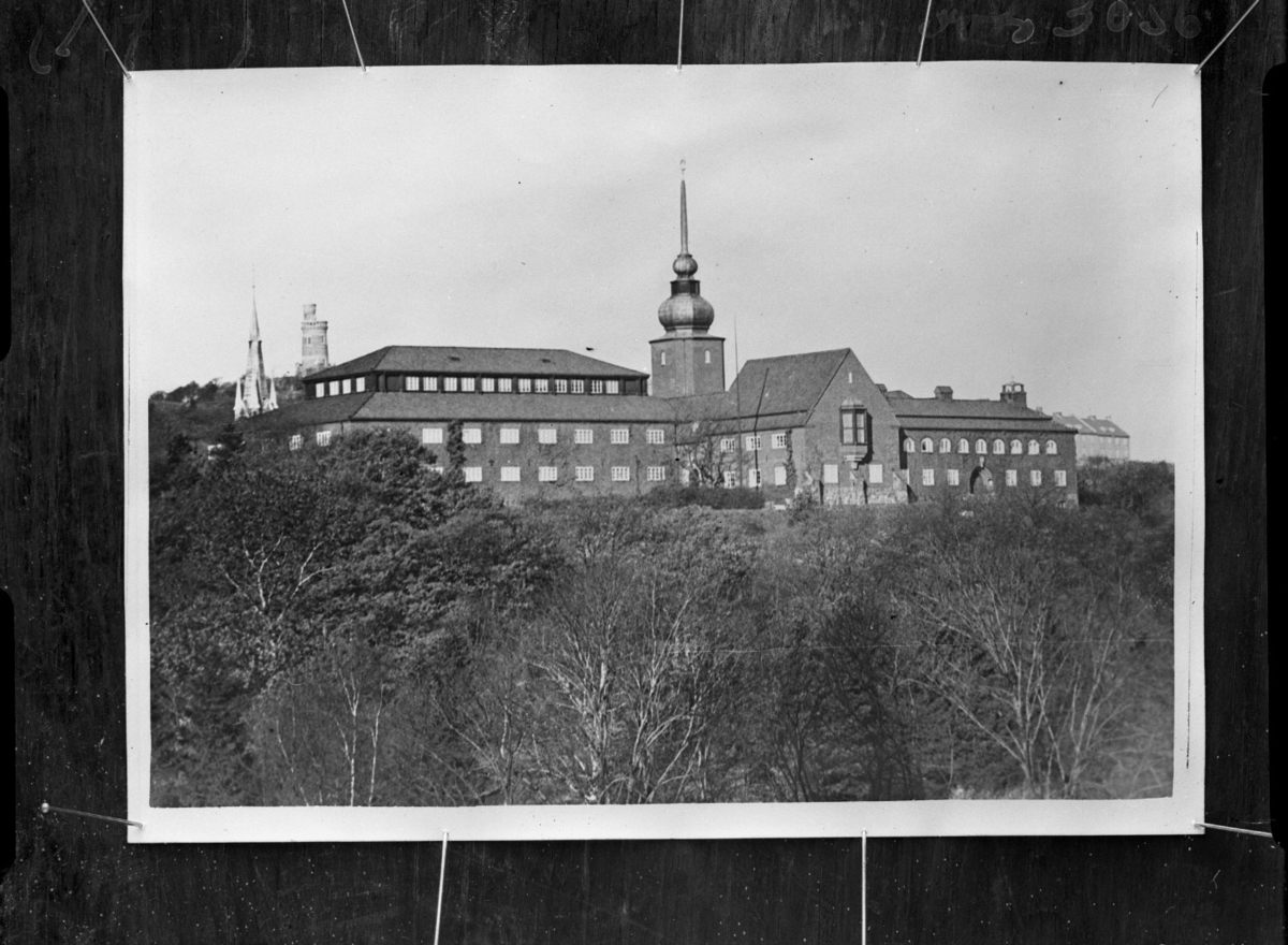 Vy med Naturhistoriska museet i Slottsskogen sett från Annedalskyrkans håll. Till vänster syns utsiktstornet samt kyrktornet tillhörande Vegahemmet.