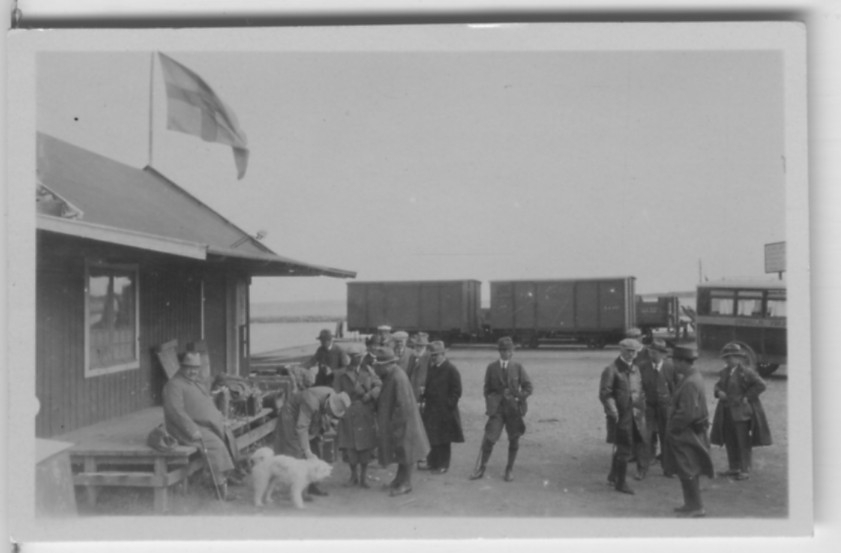 'Biologiska föreningens utfärd till Öland. :: :: Text enligt foto: ''Hamnen i Kalmar, avfärden''. Gruppen, ca 16 st personer, samlad vid trähus med flagga. 1 st hund och 3 st transportvagnar synliga. :: :: Se även fotonr. 2607-2625, 2583-2606 samt 2883-2911 från samma utfärd.'