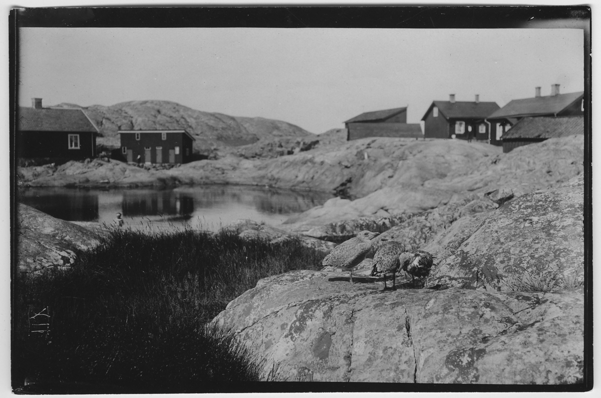 '3 st ätande havstrutungar i förgrunden. ''De tama havstrutungarna, 1 månad gamla''. Vy med berghällar och 5 hus. :: :: Se serie med fotonr. 468-475.'