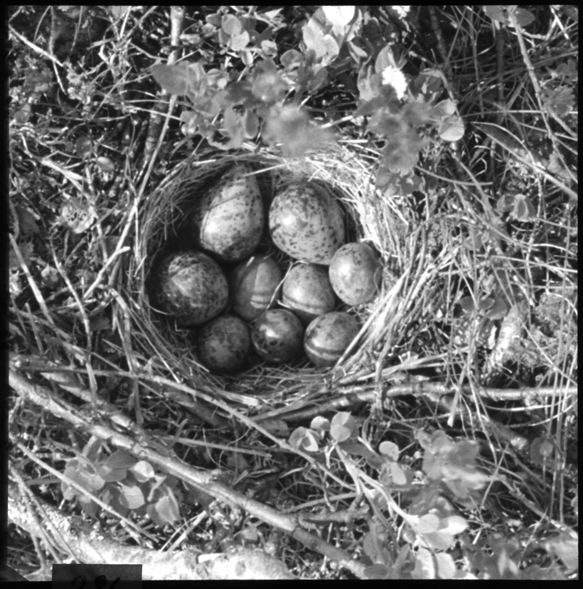 'Bildtext: ''Bo av lappsparv, innehållande 6 lappsparvsägg + 3 mosnäppägg.'' Närbild på bo med ägg av mosnäppa samt lappsparv. :: :: Ingår i serie med fotonr. 5174:1-8, numrerade med bildnr 285-292. Se även hela serien med fotonr. 5155-5174.'