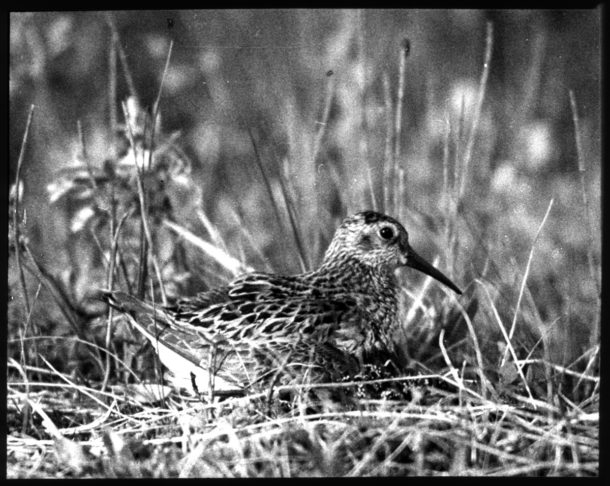 'Bildtext: Kärrsnäppa, ruvar.'' Kärrsnäppa, närbild, sedd från sidan. Liggande i gräs/vassvegetation. :: :: Ingår i serie med fotonr. 5160:1-9, se även hela serien fotonr. 5155-5162.'
