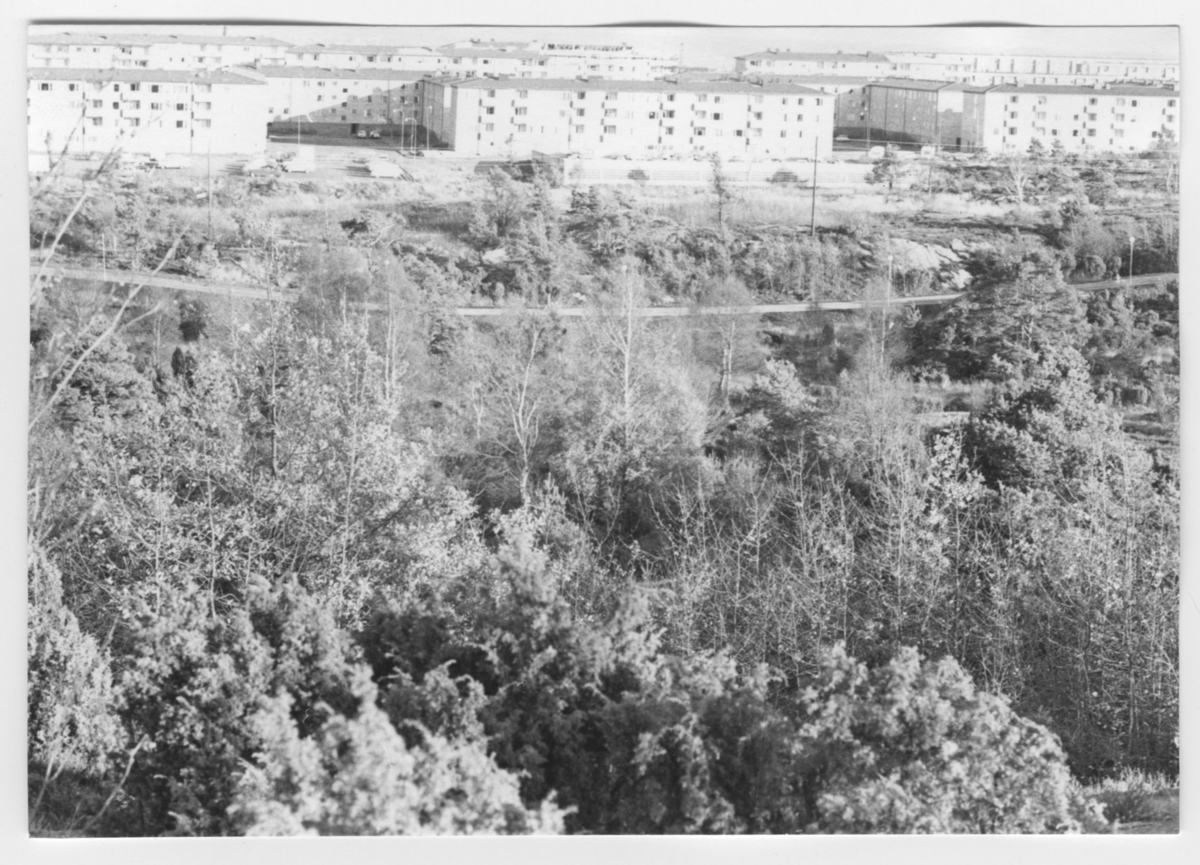 'Bildtext: ''Skogsparti. Riktning 110.'' :: :: Ingår i serie med fotonr. 6970:1-1125, dokumentation av Hisingens naturgeografi, visande landskapsformerna i stora drag och gjord inför exploateringen av området. Platserna för fotograferingen finns utsatta på karta i skala 1:4000 som finns på Göteborgs Naturhistoriska musem. Fotoriktningen mättes med kompass i gammalgrader.'