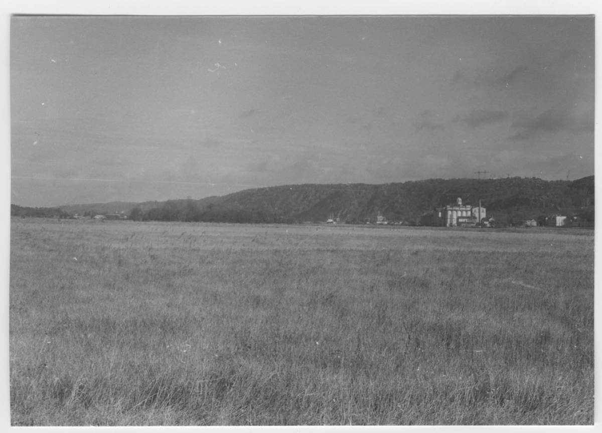 'Bildtext: ''Götaälvdalgången. Riktning 37.'' Vy över öppet fält och på avstånd fabrik ''Axa''. Se även fotonr. 6970:849. :: :: Ingår i serie med fotonr. 6970:1-1125, dokumentation av Hisingens naturgeografi, visande landskapsformerna i stora drag och gjord inför exploateringen av området. Platserna för fotograferingen finns utsatta på karta i skala 1:4000 som finns på Göteborgs Naturhistoriska musem. Fotoriktningen mättes med kompass i gammalgrader.'