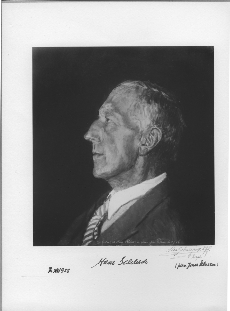 'Tecknat porträtt av Hans Schlesch. :: På bilden står ''Till Gertrud och Hans Schlesch av vännen Jonas Åkesson 2/7-1958.'