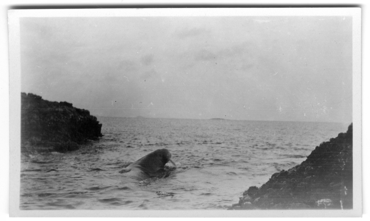 'Valross i vik, huvudet över ytan. Sedd från sidan. :: :: Ingår i serie med fotnr. 1586-1588.'