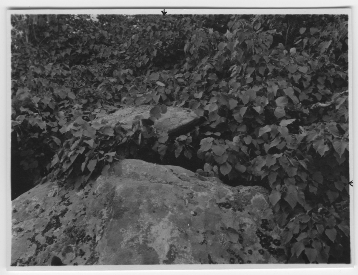 'Storskrake, häckningsplats på Flatholmen i Mjörn. Stenblock med buske i bakgrunden. :: :: Se serie med fotonr. 1174-1187.'