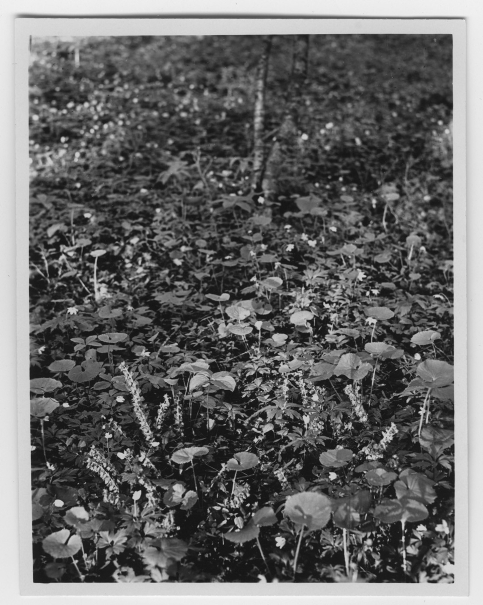 'Parti från en lund vid Hjälstaviken, närbild på växter. Örtvegetation, markvegetation med bl.a. vitsippa, lejongapsväxter, lundsmörblomma och ormbär. Text på baksidan: ''Parti av lunden i sydväst med Lathraea, Ranunculus cassubicus, Paris m.fl.'' :: :: Ingår i serie med fotonr. 2305-2346.'