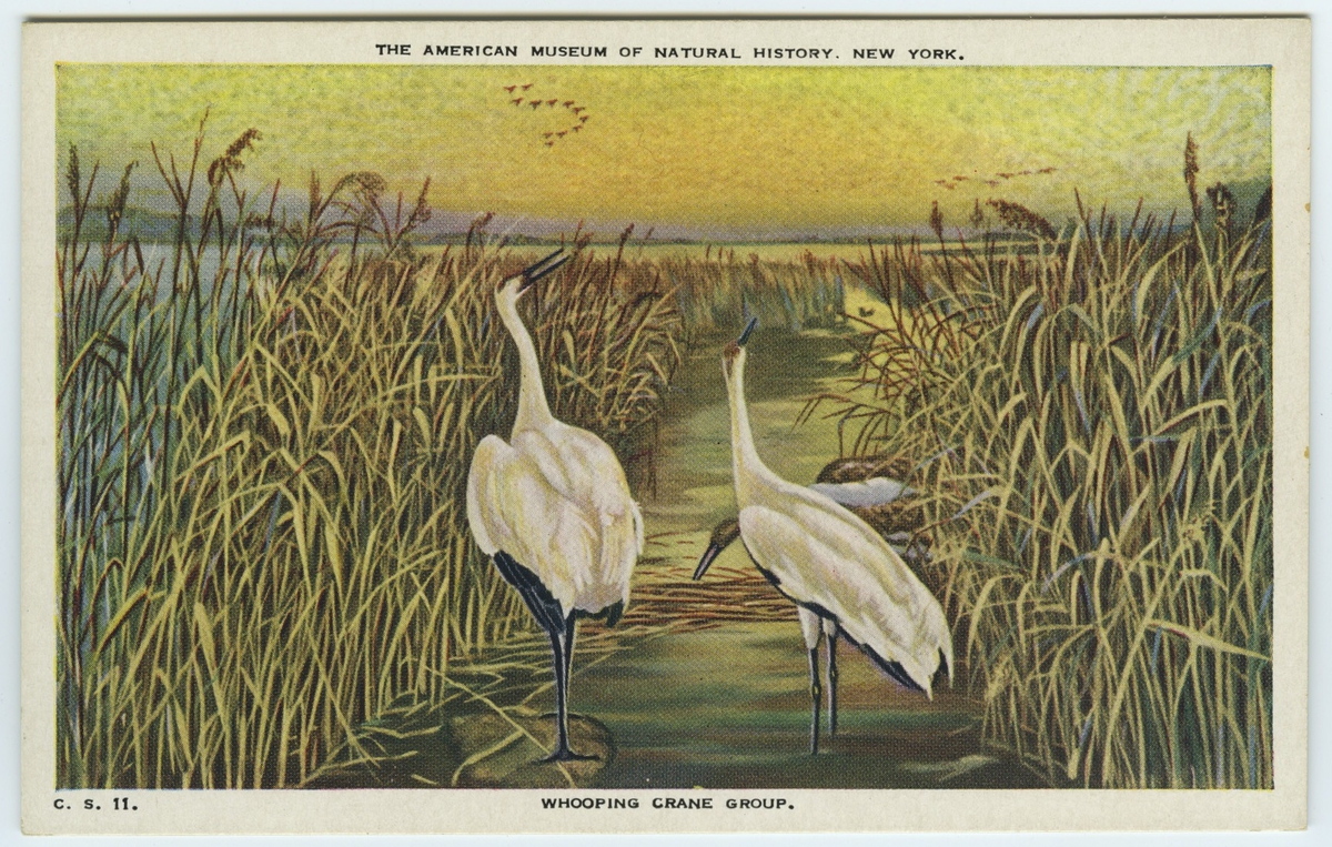 '3 tranor i vatten invid vass. Artern nästan utrotad, har inte häckat i U.S.A. sedan 1894. Text på baksidan: ''Whooping crane. This bird is now nearly extinct. It has not been known to nest in the United States since 1894. The few remaining speciments breed in the interior of British Columbia.'' :: :: Ingår i serie med fotonr. 2941-2954. Se även serie med fotonr. 2930-2940 med vykort delvis samma motiv, icke kolorerade.motiv.'