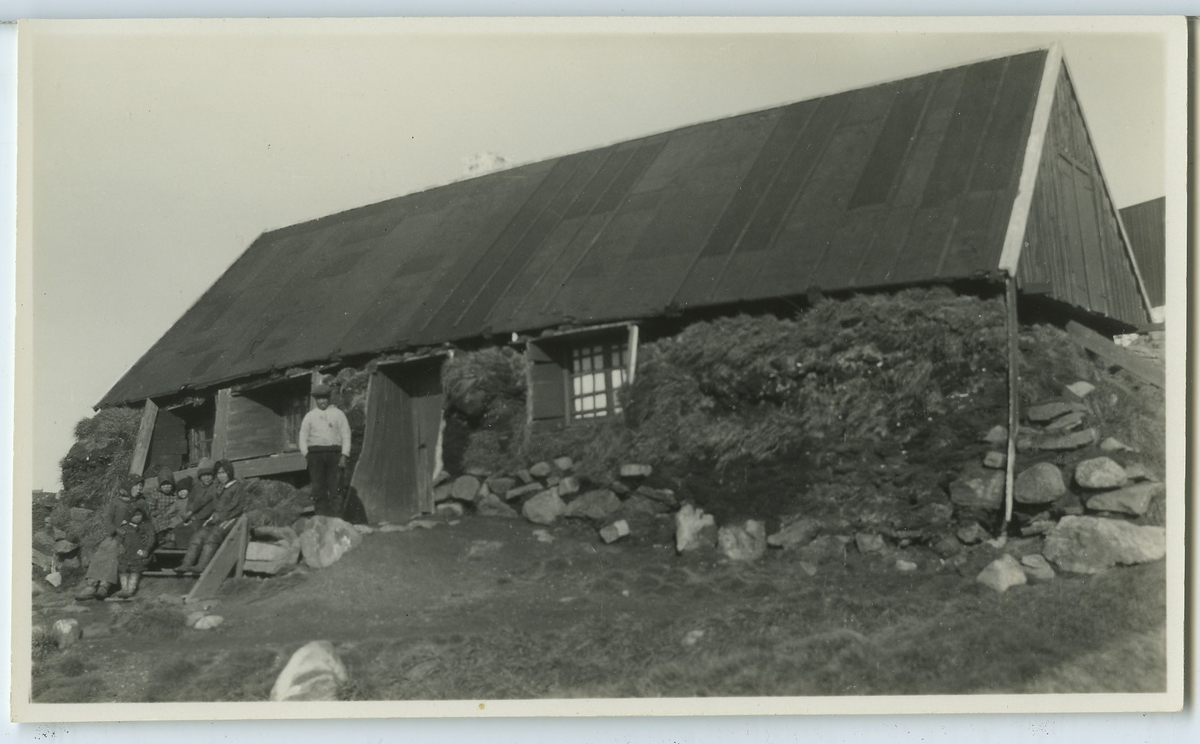 'Gamla snickaraffären och fängelset. En inuit(eskimå)man står intill dörren till huset. En grupp av 6 inuiter (eskimåer) sitter på en trätrappa till huset. Barn, kvinna, man. Kläder. Klädsel. :: :: Enligt kuvertet som negativet låg i ''Trip to W-Greenland''. :: :: :: Ingår i serie Fotonr. 5217:1-103. Se även hela fotonr. 5202-5218 med bilder från Frits Johansen.'