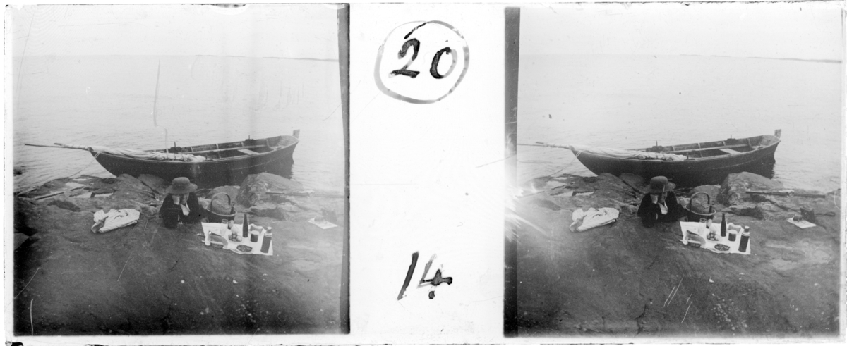 'Bildtext: ''Elsa at Måshällan.'' (Elsa vid Måshällan) :: 1 kvinna, Elsa, halvliggande på berghäll ner mot vattnet, med eka, båt halvt uppdragen. Framför sig uppdukad picnick med glasflaska, termos, glasburk och mat, flätad korg stående intill. :: :: Ingår i serie med fotonr. 5250:1-21, se även hela serien med fotonr. 5237-5267.'