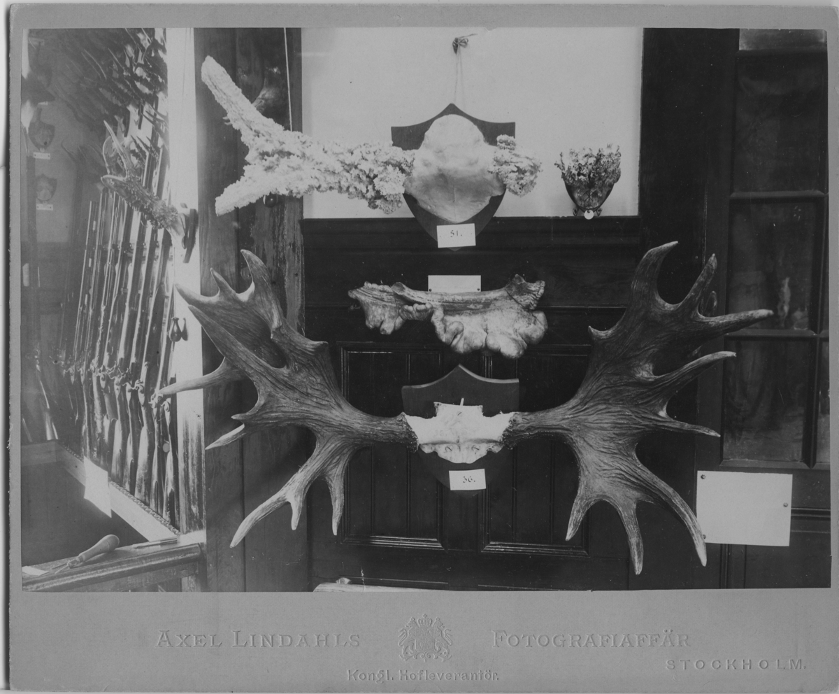 'Diverse foton på horn och gevär från jaktutställningar. :: :: Fyra horn hängandes på en vägg. I vänstra delen av bakgrunden hänger ytterligare horn samt är gevär uppställda. :: :: Ingår i serie med fotonr. 5599:1-17.'