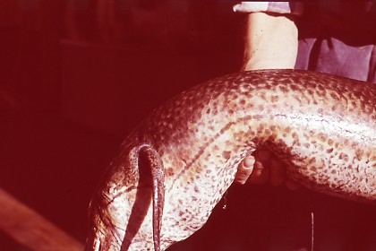 'Bilder en död lungfisk från akvariet. Avgjuten och placerad i basutställningen på Göteborgs Naturhistoriska museum, 1960. Avgjutningen gjord av Björn Wennerberg. :: :: En person håller i fisken, Mittendelen av fisken fotograferad.'