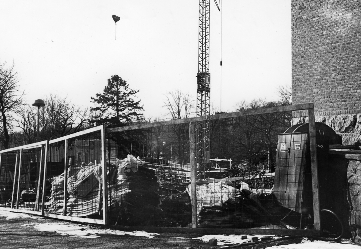 'Tillbyggnaden av Göteborgs Naturhistoriska Museum mars 1979. Södra sidan av Göteborgs Naturhistoriska Museum. Foto över byggarbetsplatsen. Lyftkran. Staket runomkring. :: :: Ingår i serie med fotonr. 5527:69-216.'