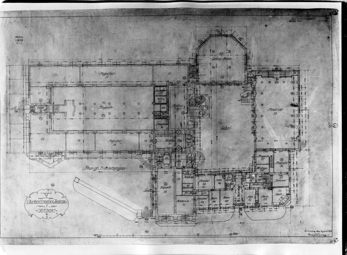 'Interiör: ''Plan af Bottenvåningen''. :: :: Ingår i serie med fotonr. 6067:1-7 med planritningar, såväl exteriör som interiör, inför nybyggandet av Naturhistoriska Museet i Göteborg.'