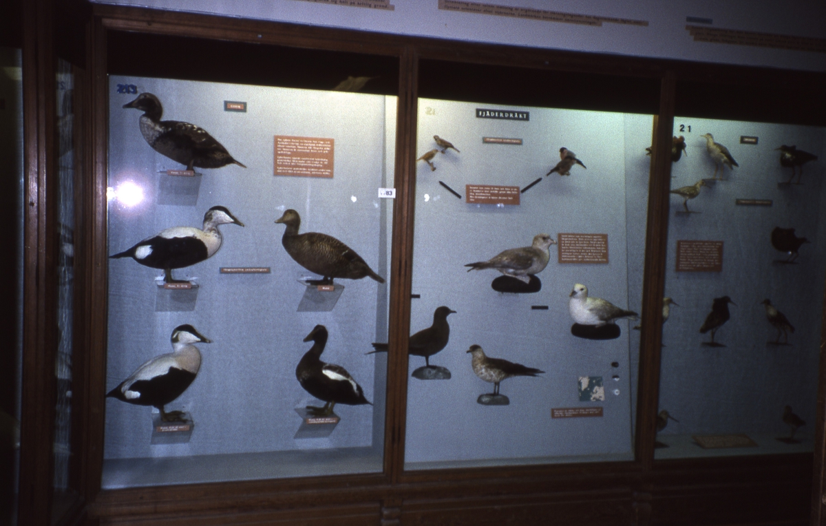 'Montrarna i fågelgången fotograferade före restaurering. :: Svenska fåglar. Fjäderdräkt. :: :: Ingår i serie med fotonr. 6939:1-54.'