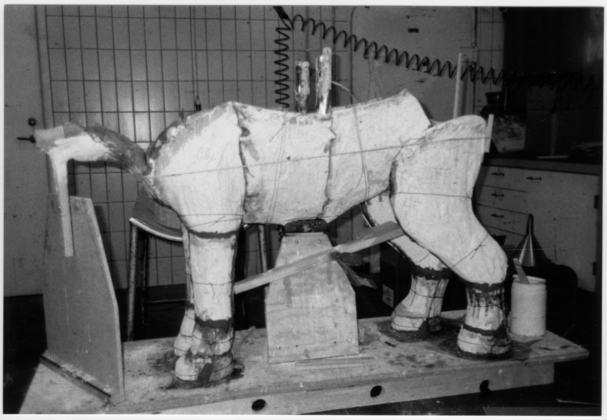 'Montering av varg: :: Närbild på gipsnegativet, fotograferat från sidan. Gipsnegativet stående på arbetsbord, övre delarna av gipsnegativet borttagna. Coll.an: 14836. :: :: Ingår i serie med fotonr. 6926:1-11: Konservator Åke Melin monterar den s.k. Mölndalsvargen, en ung varghane, som inkom till Göteborgs Naturhistoriska museum 1992-05-28. Montaget finns (06-06-21) i däggdjurssalen på Göteborgs Naturhistoriska museum.'