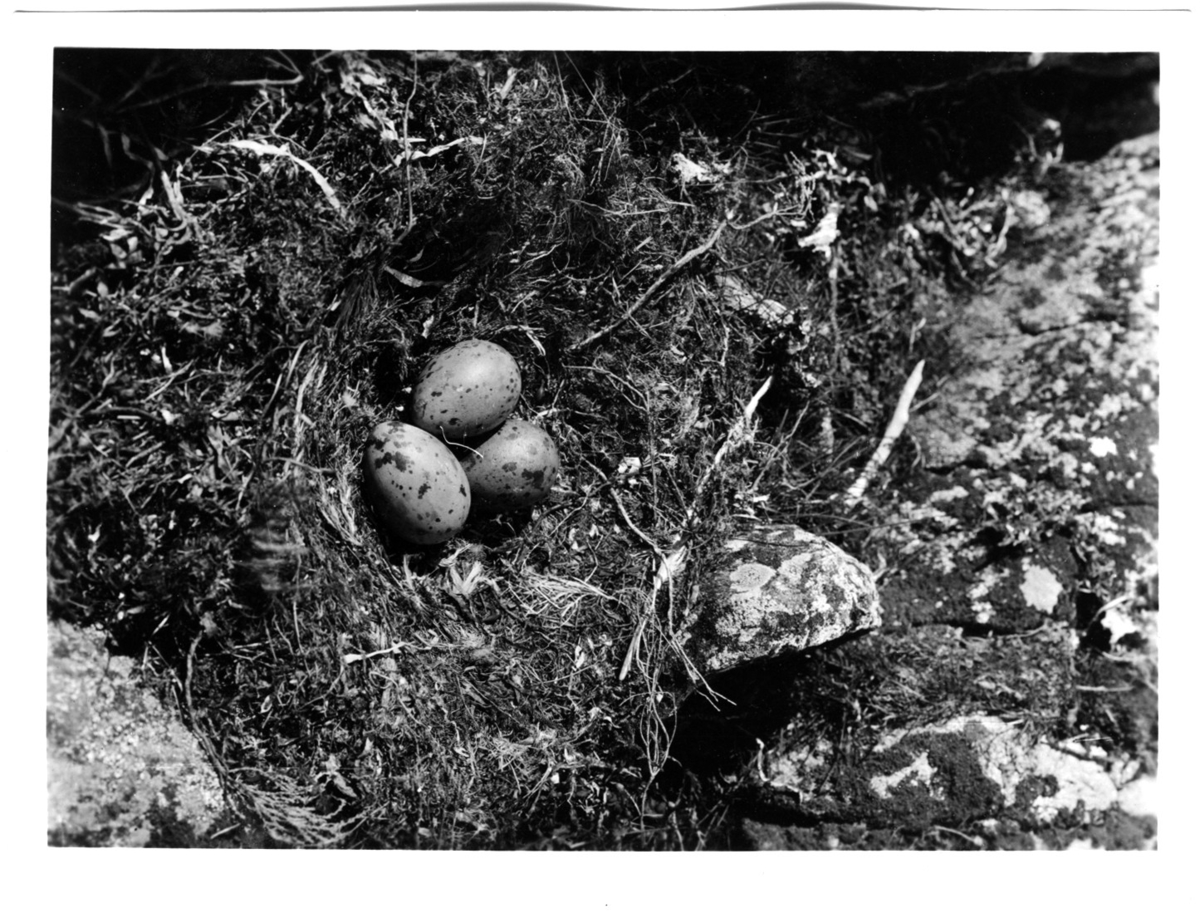 'Havstrutbo med 3 st ägg. Närbild. :: Text till fotot: ''Havstrutens rede.'' :: :: Ingår i fotonr. 6995:1-51, dessa sitter i ett fotoalbum med tillhörande beskrivningar på norska.'