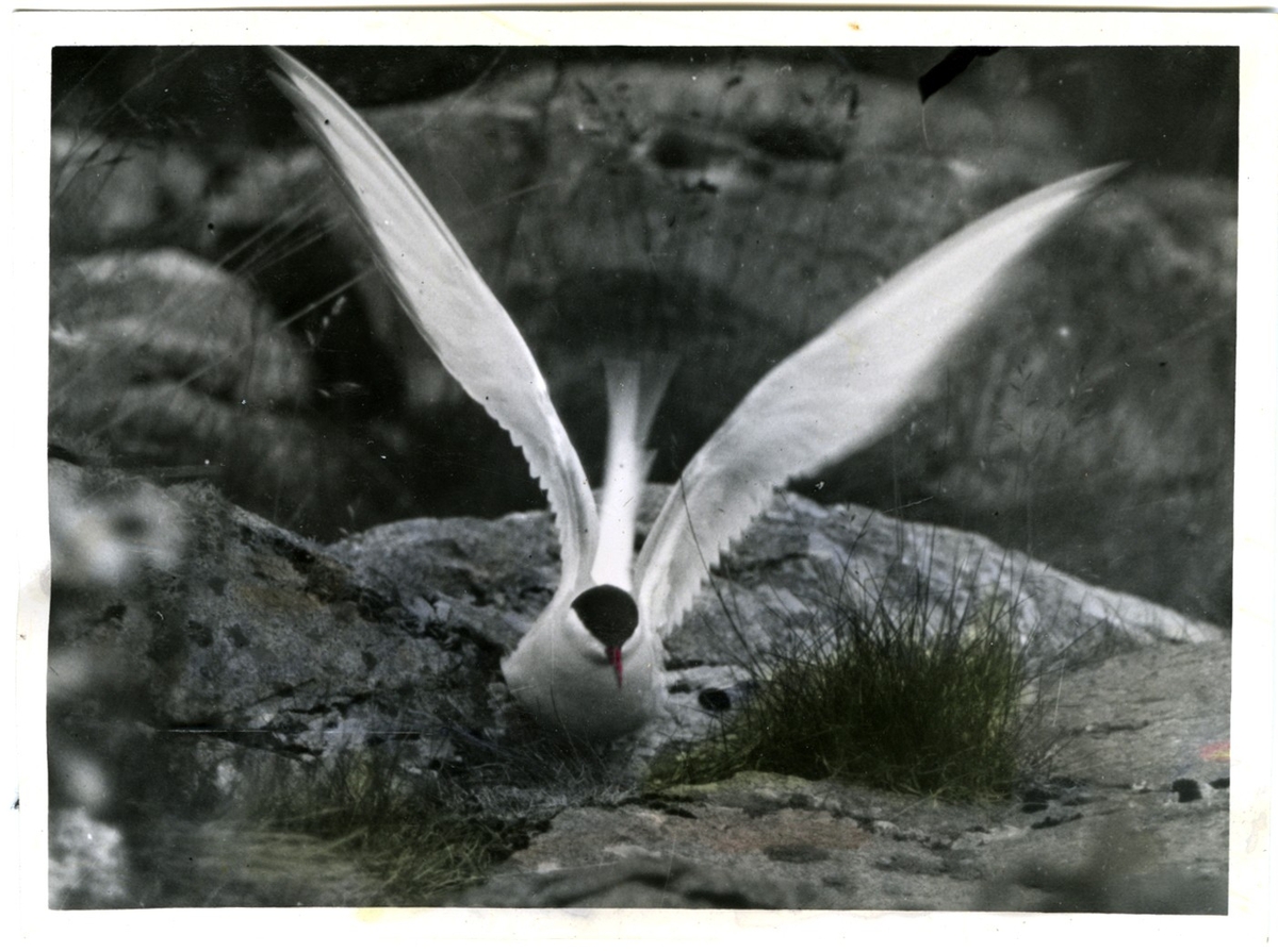 'Fisktärna slår sig ner på boet på berghäll. :: Text till fotot: ''Ruvande fisktärna vid Ellwsäg Sinöla?''. :: :: Ingår i fotonr. 6995:1-51, dessa sitter i ett fotoalbum med tillhörande beskrivningar på norska.'