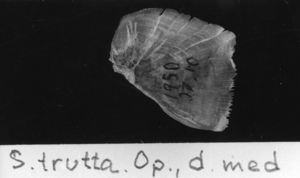 'S. trutta. Op., d., med. :: (Salmo trutta Operculum, dexter, medialt) :: :: Ingår i serie med fotonr. 7094:1-48'