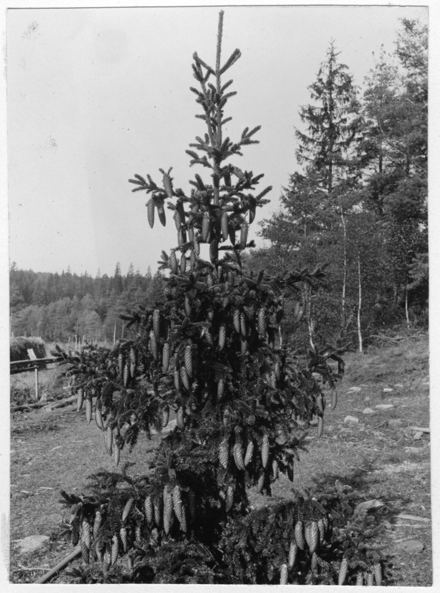 'Bildtext: ''Grantopp med kottar.'' Närbild på gran med kottar. :: :: Fotonr. 7046:293-306 indelade som ''Skogsmarken. Trädens byggnad och livsföreteelser.''. Ingår i serie med fotonr. 7046:1-383, 7047:1-33 och 7048:1-67 med bilder från Länsjägmästare John Lindners bildarkiv.'