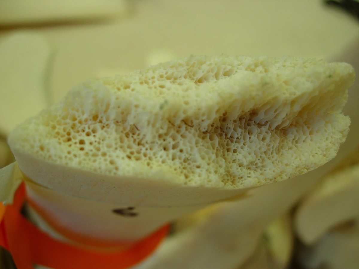 'Monteringsarbetet med näbbvalen, hane, Valders skelett. :: Närbild på porerna i avbruten skelettbit. :: :: Skelettet till näbbvalen är monterat och hänger i valsalen på Göteborgs Naturhistoriska Museum. Då näbbvalen sågs utmed kusten kom den att kallas Valder i media. :: :: Ingår i serie med fotonr. 7106 med bilder på näbbvalen som levande och under arbetet med att montera skelettet.'