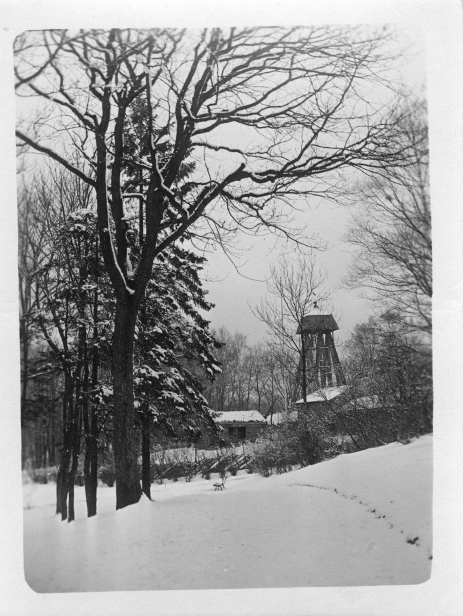 Klockstapeln vid Smålandsgården, i snö. Vinterlandskap.