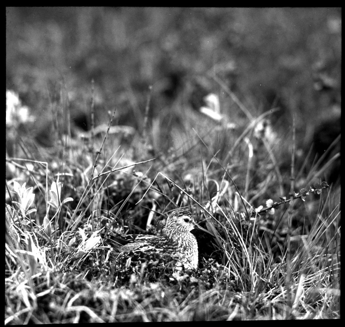 'Bildtext: ''Kärrsnäppa, ruvar.'' Kärrsnäppa, sedd från sidan, närbild. Liggande i gräs/vassvegetation, på boet. :: :: Ingår i serie med fotonr. 5160:1-9, se även hela serien fotonr. 5155-5162.'