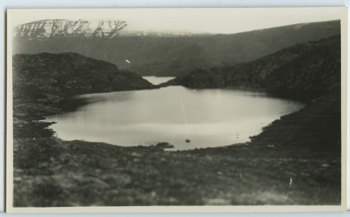 'Sjö och berg. En av tre sjöar som binder samman Kasorsuak halvön med resten av Diskoön. Tre sjöarna heter Mellemsoe (Mittensjön), Lillesoe samt Lang-soen (Långsjön). Se även fotonr. 5217:88 och 89. :: :: Ingår i serie Fotonr. 5217:1-103. Se även hela fotonr. 5202-5218 med bilder från Frits Johansen.'