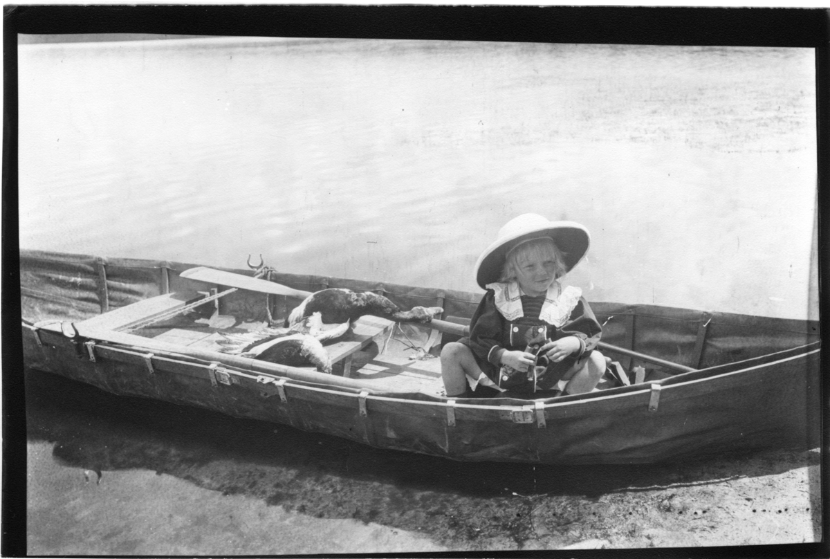 'Diverse fotografier från bl.a. dåvarande Nordrhodesia, nu Zambia, tagna av Konsul Magnus Leijer. :: :: Ett barn sittandes i en eka, uppdragen delvis på strand. I båten ligger åror och 2 fåglar.'