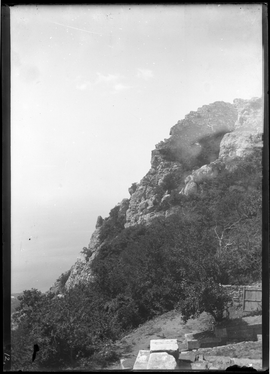 'Vy med bergbrant, ev hav och träd. :: :: Ingår i serie med fotonr. 5287:1-22. Se även fotonr. 5269-5292 med bilder från Stuxbergs resa till Kaukasien.'