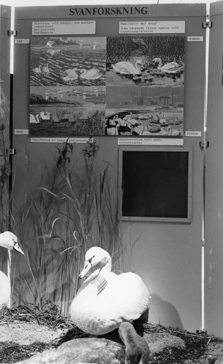 'Foto på Jubileumsutställningen, Göteborgs Naturhistoriska museum 150 år. :: :: Utställningsskärm från svanavdelningen angående svanforskning, med fotografier visande svanflyttning på skärmen, samt delar av tre monterade svanar framför skärmen.'