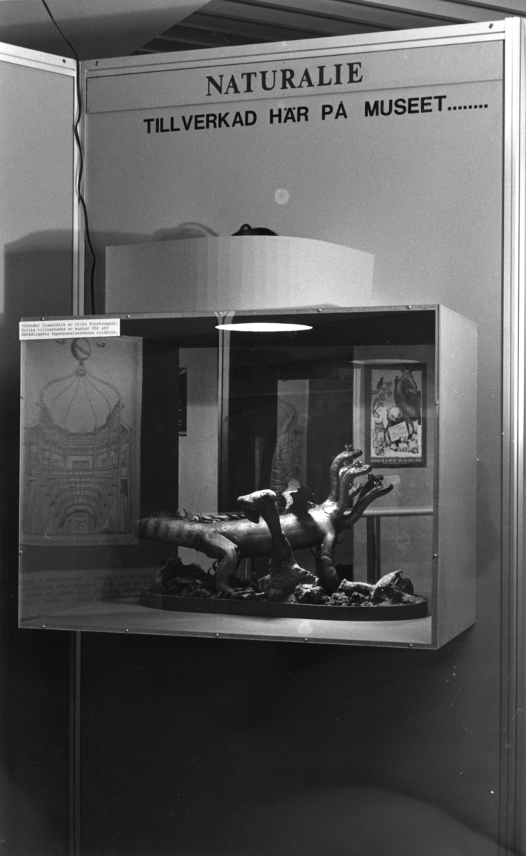 'Foto på Jubileumsutställningen, Göteborgs Naturhistoriska museum 150 år. :: :: ''Vidunder framställt av olika djurkroppar. Dylika tillverkades av munkar för att åskådliggöra Uppenbarelsebokens vilddjur.'''
