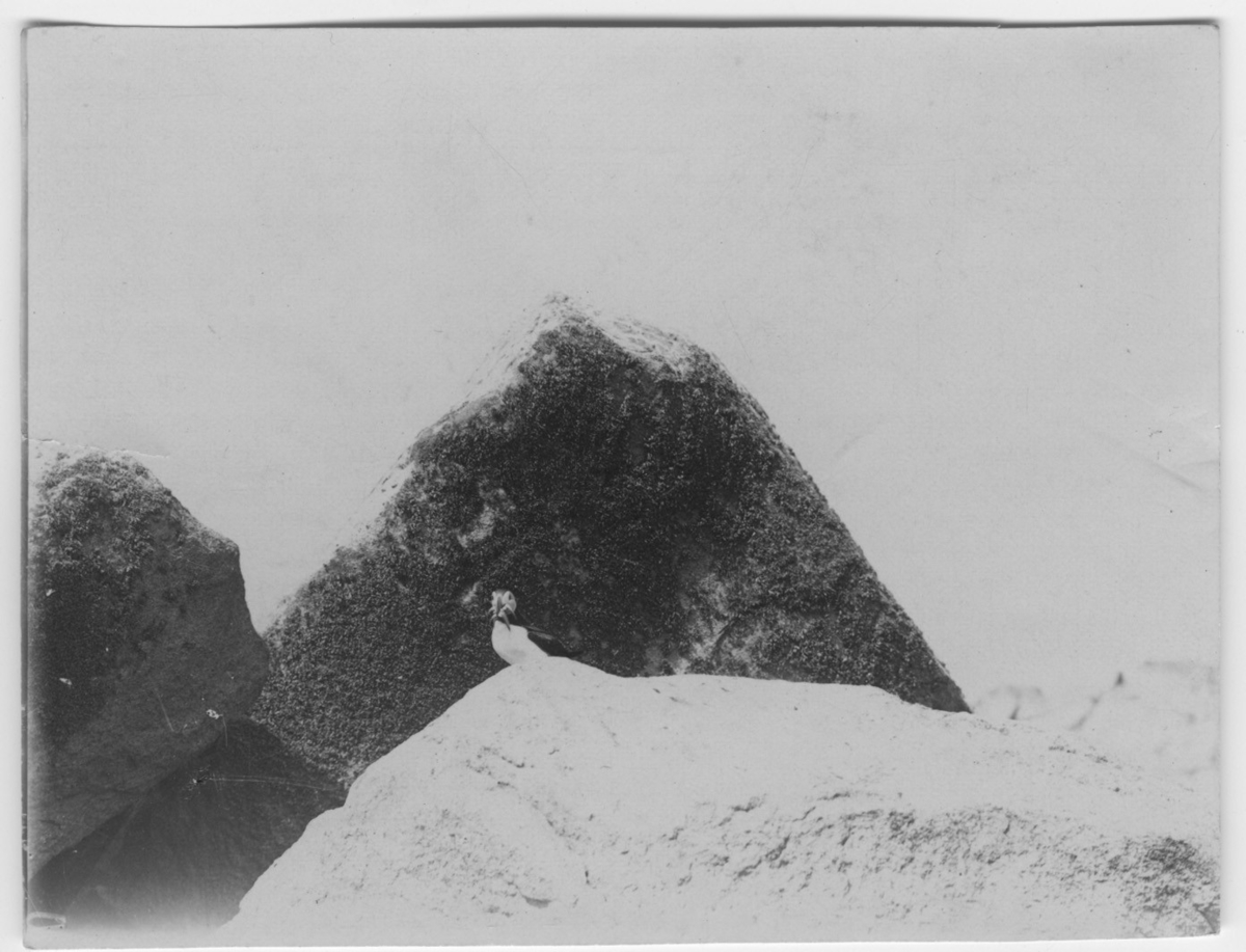'Lunnefågel. Parti av Soteskär med häckplats. :: Bild över stenblock i förgrunden, skär och hav i bakgrunden. :: :: Ingår i serie med fotonr. 694-697.'