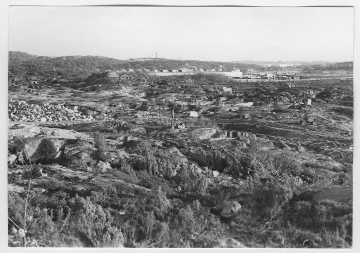 'Bildtext: ''Hällandskap. Riktning 126.'' :: Byggnationsområde, exploateringsområde. Vy över berghällsparti och på avstånd anläggning. :: :: Ingår i serie med fotonr. 6970:1-1125, dokumentation av Hisingens naturgeografi, visande landskapsformerna i stora drag och gjord inför exploateringen av området. Platserna för fotograferingen finns utsatta på karta i skala 1:4000 som finns på Göteborgs Naturhistoriska musem. Fotoriktningen mättes med kompass i gammalgrader.'