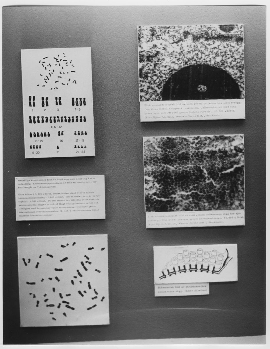 Del av utställningsskärm med bilder och texter av kromosomer hos människa och cellkärna hos sjöborreägg.