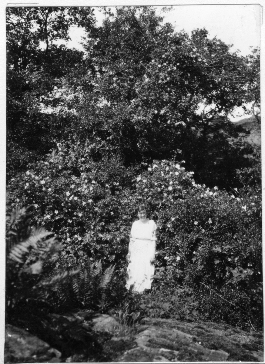 'Bildtext: ''7 meter hög, rankande vildrosbuske (Rosa canina).'' 1 kvinna står framför blommande stenrosbuske. :: :: Fotonr. 7046:213-233 indelade som ''Buskar, blommor m.m.'' i Göteborgs län och Bohus län''. Ingår i serie med fotonr. 7046:1-383, 7047:1-33 och 7048:1-67 med bilder från Länsjägmästare John Lindners bildarkiv.'