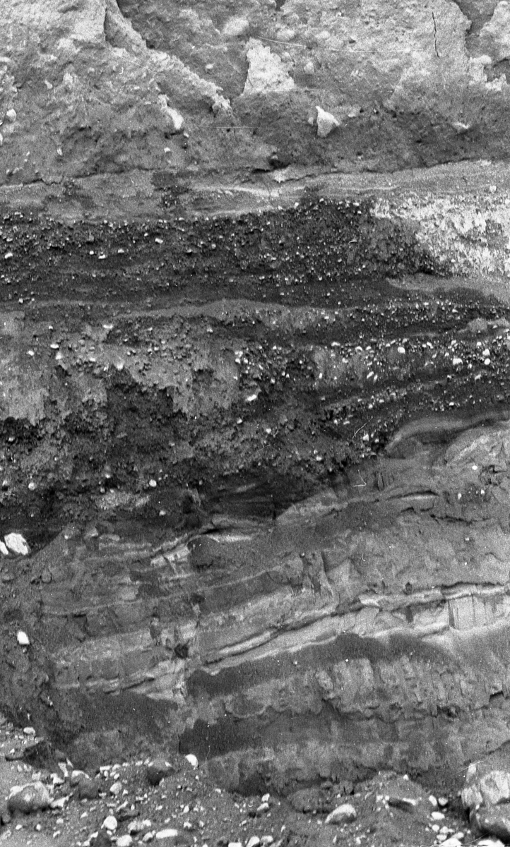 'Närbild på vägg i sandtaget, moränens lager synlig. :: :: Ingår i serie med fotonr. 7096:1-30 med bilder från Dösebacka sandtag med omgivning.'