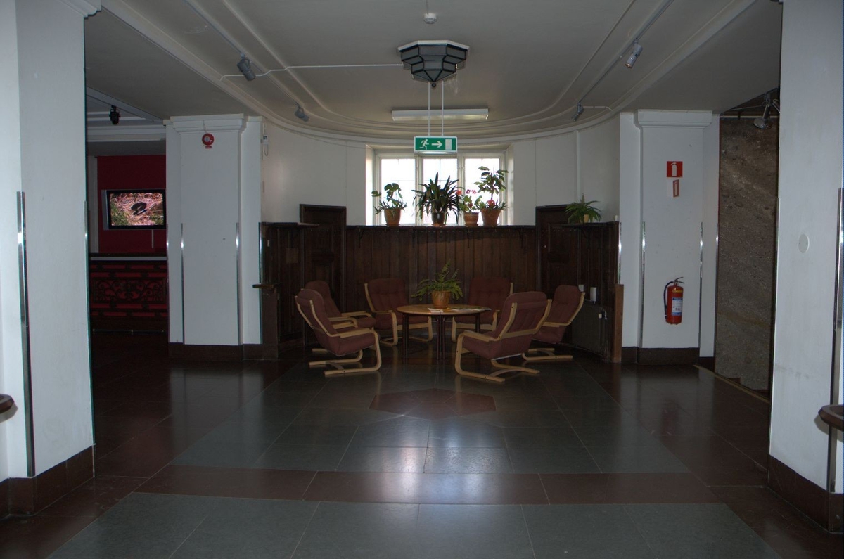 'Vy över soffgrupp stående invid gamla entrén, framför gamla klädhängare. :: :: Fotonr. 7095 består av en bildserie som dokumenterar diverse utrymmen i byggnaden så som kontor, arbetsplatser, arbetsrum, magasin m.m. Bilder tagna före och efter olika ombyggnationer bl.a.'