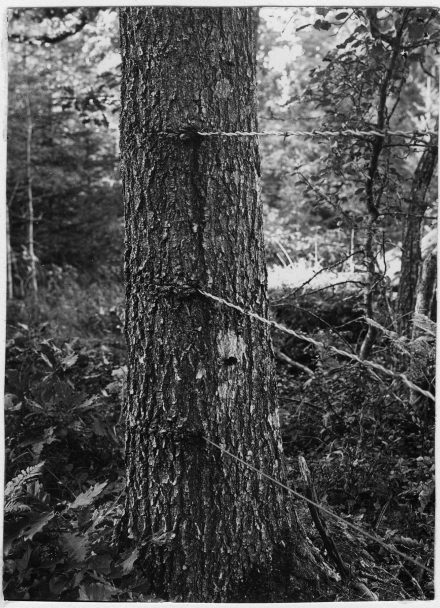 'Bildtext: ''För 25 år sedan fastspikades stängseltrådarna på en smal ekteling. Trådarna gå nu genom ekens centrum. Stängslet gör vinkeli eken och syns därför int på andra sidan trädet.'' Närbild på taggtråd som vuxit fast i ekstam. :: :: Fotonr. 7048:1-26 indelad under rubriken ''Däggdjur, Människor''. Ingår i serie med fotonr. 7046:1-383, 7047:1-33 och 7048:1-67 med bilder från Länsjägmästare John Lindners bildarkiv.'