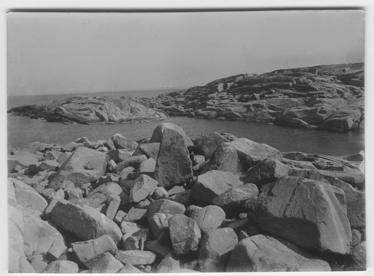 'Lunnefågelns häckplats på Soteskär. Bilden tagen under professor Leonard Axel Jägerskiölds och dr Rud. Söderbergs färd dit. Vy med i förgrunden hög med stenblock och havet med berghällar på avstånd. :: :: Ingår i serie med fotonr. 817-841.'