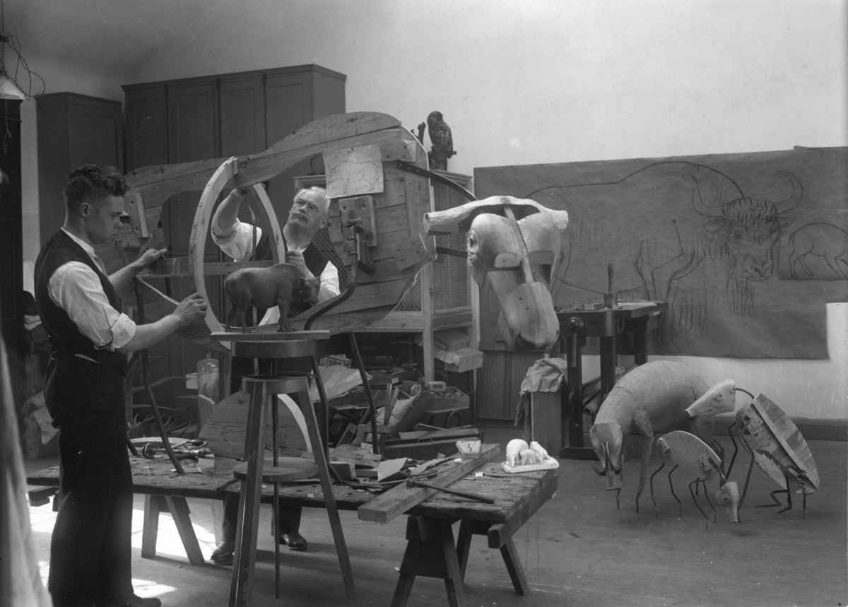 'Hilmer Skoog och ytterligare en man under arbetet med monteringen av jaken, i konservatorsateljen. I färd med att bygga stommen med profilbräda. På golvet stomme till gruppen med 3 st hjortsvin. På väggen skiss till jaken. Framför miniatyrmodell av jaken. :: :: Ingår i serie med fotonr. 921-923.'